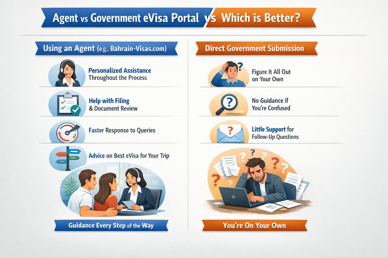 When applying, travelers often choose between working with a travel agent (like “bahrain-visas.com”) and filling in forms directly through channels.