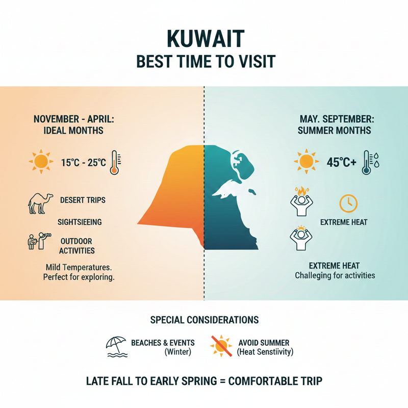 Visiting late fall to early spring is the best choice for a comfortable trip to Kuwait.